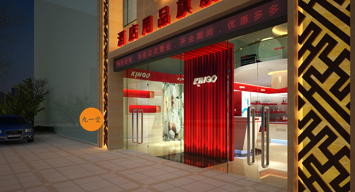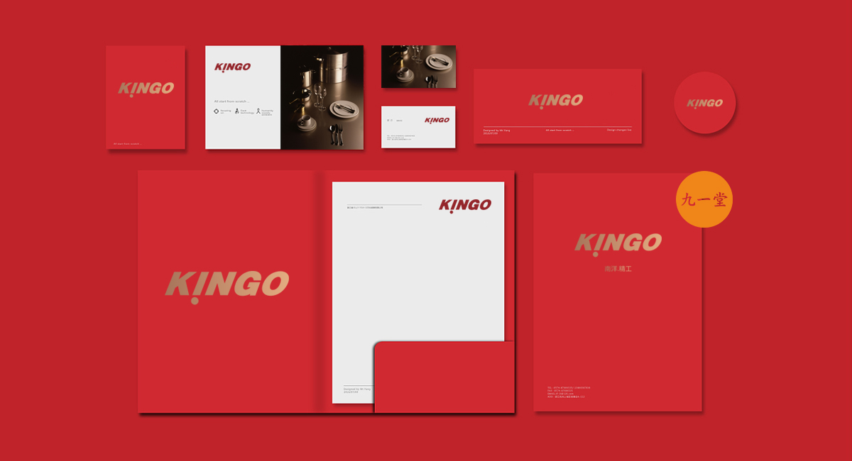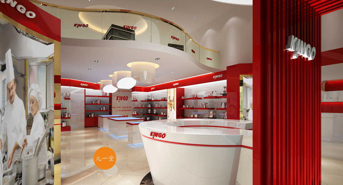 南洋精工是一家提供星級酒店設備用品的品牌公司,九一堂品牌設計對本案進行研究討論后,決定以提升整個品牌氣質為主,在色彩上加入流行色玫瑰金,把整個展廳的色彩比例調整為60%白色,35%紅色,5%金色。金色在整個品牌氣質里起到了畫龍點睛的作用。而在整個展廳設計中,為了更好展示不銹鋼材質,巧妙用了展柜發(fā)光以及對展柜下面使用氛圍燈光的手法,室內展柜材質則多用亮面烤漆來表現,增強與產品本色不銹鋼材質的對比,更好的突出產品特質。整個門頭則用米黃色石材,與星級酒店的大氣高品質做呼應,體現南洋精工的品牌核心價值。