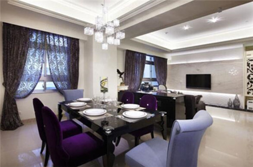 如果家里的空間較小,無(wú)法獨(dú)立安排出一個(gè)空間作為飯廳的話,不妨借鑒下這張圖中的設(shè)計(jì)。主人采用了黑色的矮柜作為分隔,既保證了空間的獨(dú)立性,有保證了室內(nèi)空間的開(kāi)闊性。餐廳布置得極為雅致,黑色木餐桌搭配上紫色的沙發(fā)餐椅顯得浪漫又低奢,彰顯出主人不凡的品味。