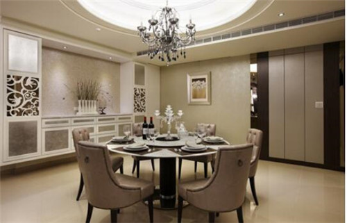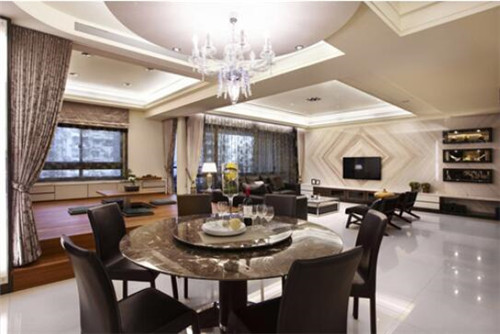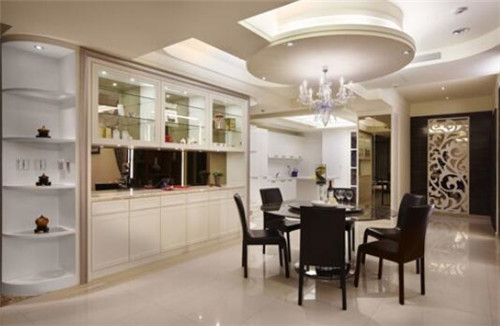 假如您家里的空間允許的話,那么就可以單獨(dú)隔出一個(gè)區(qū)域作為餐廳了。圖中是一款非常雅致的餐廳,頗具層次性的設(shè)計(jì),讓餐廳的典雅平衡入口處的華麗氣勢(shì),尤其古典美的圓弧天花、餐桌,細(xì)致的線條層層圍起,柔化了視覺(jué)沖擊力,并以金貝沙石材為臺(tái)面,帶出古典質(zhì)感。