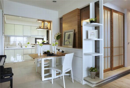 圖中這套房子面積相對(duì)小一些,房主人同樣采取了餐廚一體化的設(shè)計(jì),這樣不會(huì)帶個(gè)人絲毫的擁擠感。半開(kāi)放廚房把空間界線向后推,達(dá)到放大空間的效果,也透過(guò)拉門(mén)解決了油煙問(wèn)題。裝飾色彩的運(yùn)用上也很到位,木質(zhì)的餐廳搭配白色的餐椅,既簡(jiǎn)潔又充滿了溫馨感。