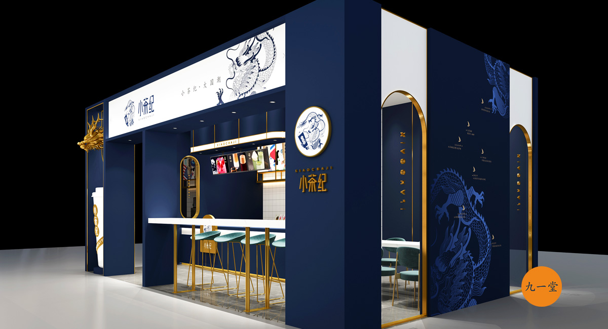 一葉神奇的東方樹葉,成為了風(fēng)靡世界的中國潮。中國是茶的故鄉(xiāng),成都是茶文化的起源地。小茶紀(jì),創(chuàng)建于成都,用一杯小茶紀(jì)成為風(fēng)靡世界的東方美茶潮流。在小茶紀(jì)的空間設(shè)計(jì)上采用深藍(lán)和金色色調(diào),體現(xiàn)小茶紀(jì)品牌的沉穩(wěn)的性格,但有沒有摒棄此品牌時(shí)尚的氣質(zhì),大面積鈦金的收邊提升了品牌整體品質(zhì)。門頭的形象墻采用龍頭的設(shè)計(jì)契合項(xiàng)目的品牌定位,體現(xiàn)出大國的豪邁,白色杯子的運(yùn)用使得整個(gè)空間時(shí)尚感十足。并且龍頭和杯子的運(yùn)用在此空間中十分搶眼,是整個(gè)空間的點(diǎn)金之筆。