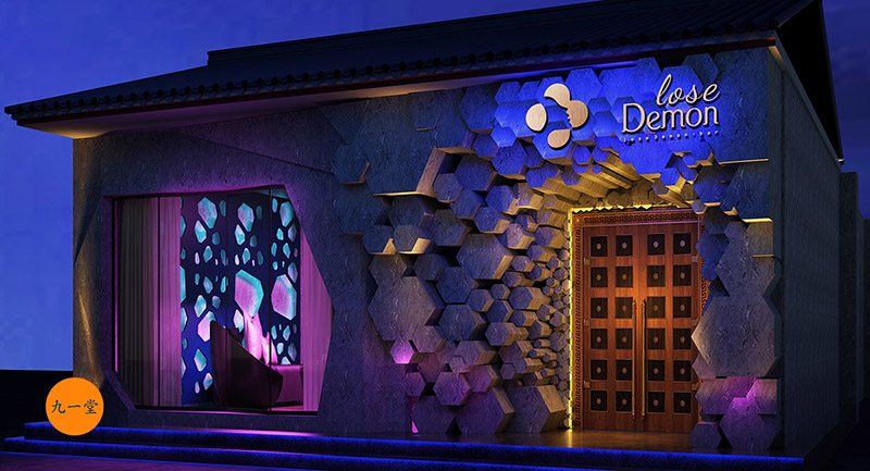 隨著時(shí)代的推進(jìn)80/90已然成為了餐飲消費(fèi)的主力。傳統(tǒng)的餐飲形態(tài)已經(jīng)無法取悅年輕人的飲食娛樂追求。而在主題餐廳設(shè)計(jì)中尋找到一個(gè)好的設(shè)計(jì)創(chuàng)意,則是餐廳成敗的關(guān)鍵。九一堂商業(yè)空間設(shè)計(jì)在本案設(shè)計(jì)中將年輕人喜愛的酒吧搬進(jìn)了餐廳,讓整個(gè)空間既能滿足餐廳的功能需求,又能滿足酒吧的功能需求。一個(gè)空間兩種形態(tài),多種格局, 多個(gè)體驗(yàn), 使得主題餐廳設(shè)計(jì)在市場(chǎng)的潮流中更有活力和激情。Lose Demon 主題酒吧餐廳設(shè)計(jì)在門頭設(shè)計(jì)中,巧妙的運(yùn)用了六邊形的立體構(gòu)成,如蜂巢般涌出,配以藍(lán)紫色燈光,使得整個(gè)門頭設(shè)計(jì)在街道中尤為搶眼。Lose Demon餐廳的門廳入口設(shè)計(jì),裸露的紅磚墻砌筑的拱形門洞、螺紋鋼藝術(shù)排列的隔斷墻、懷舊的留聲機(jī)映入眼中,提升了空間格調(diào)與體驗(yàn)。